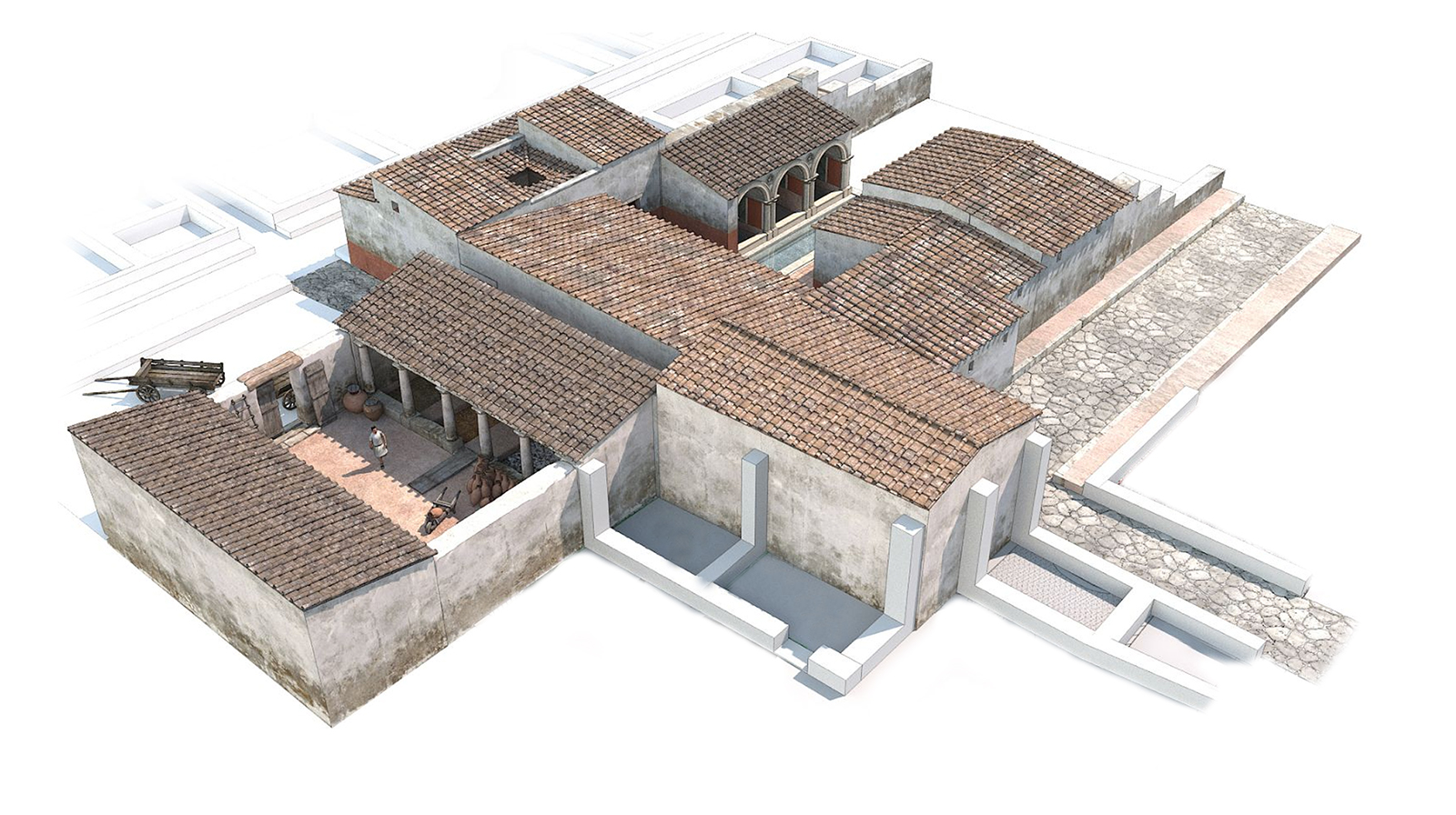 Perspectiva de la domus, distribuida en torno a un patio con pavimiento de ladrillo en el que se diferencian varias estancias de la zona residencial: un posible comedor con un banco perimetral (a la derecha), un espacio porticado con pilares de ladrillo (a continuación), lo que pudo ser la cocina con restos de fogones (al frente) y un espacio (a la derecha de esta) de nexo con la zona productiva.